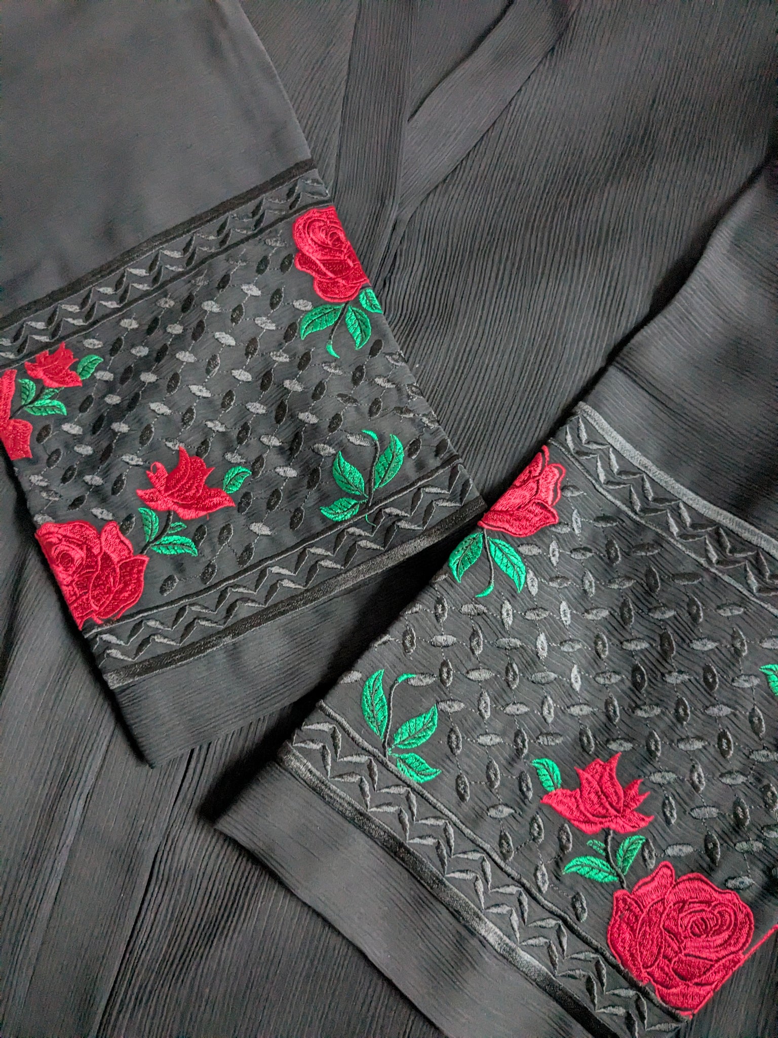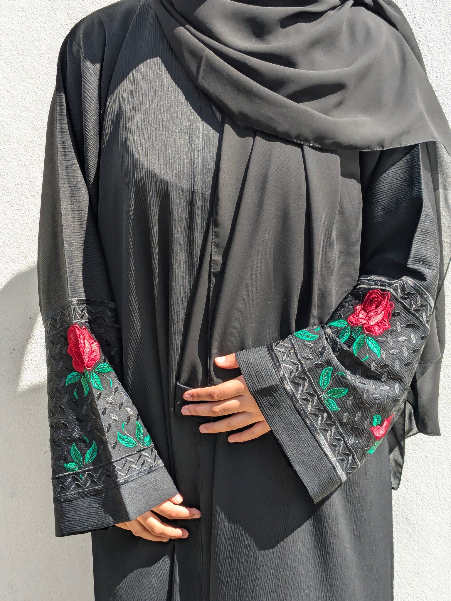 Step into timeless sophistication with our Rose Elegance Abaya, a statement piece that beautifully blends modesty with charm. This front-open abaya features intricate rose embroidery on the sleeves, adding a romantic touch to its sleek, textured black fabric. Designed with both grace and practicality in mind, it includes a matching hijab and front button closure for ease and versatility. Whether for everyday wear or a special occasion, this abaya is a must-have in your modest wardrobe.