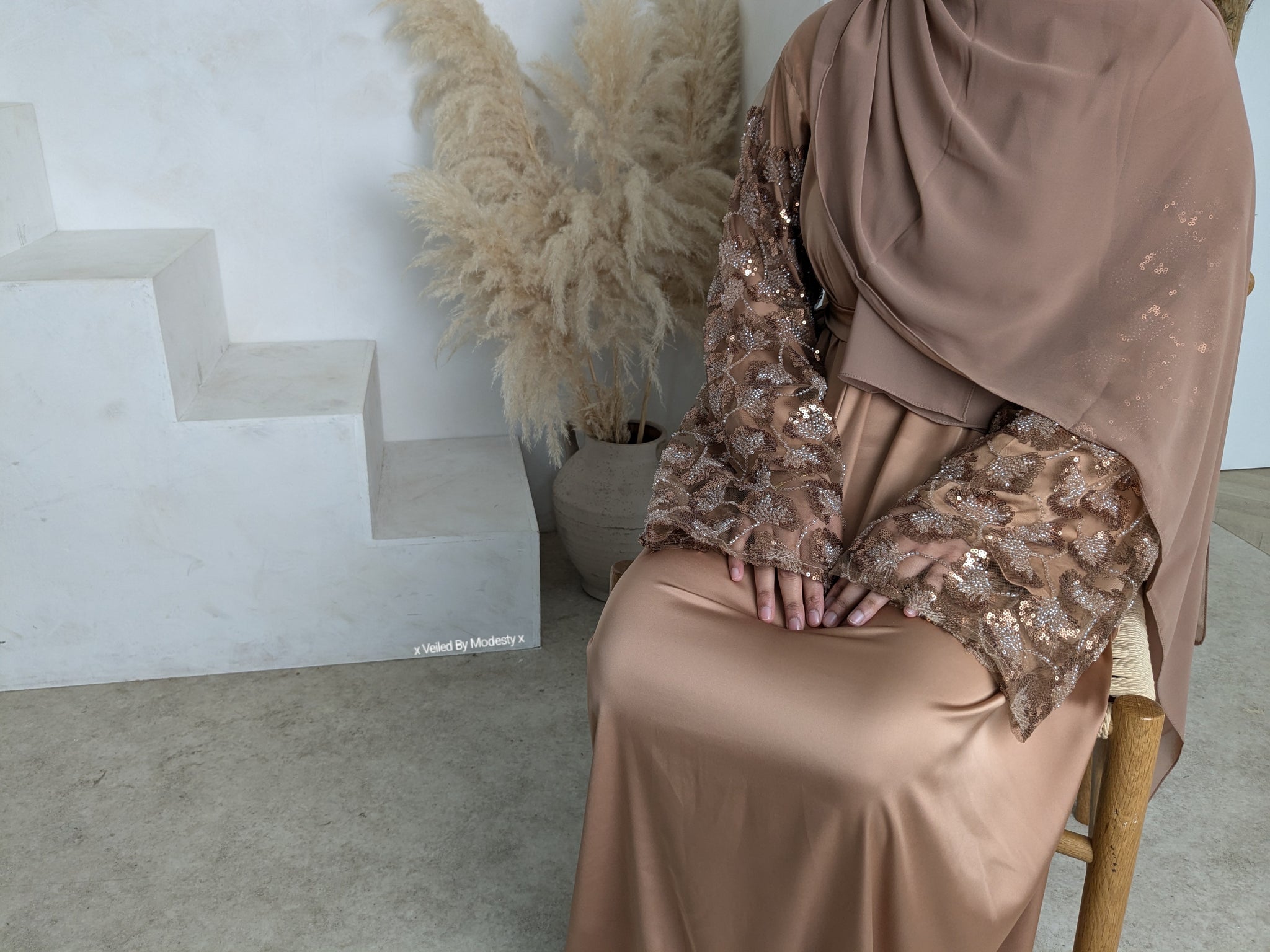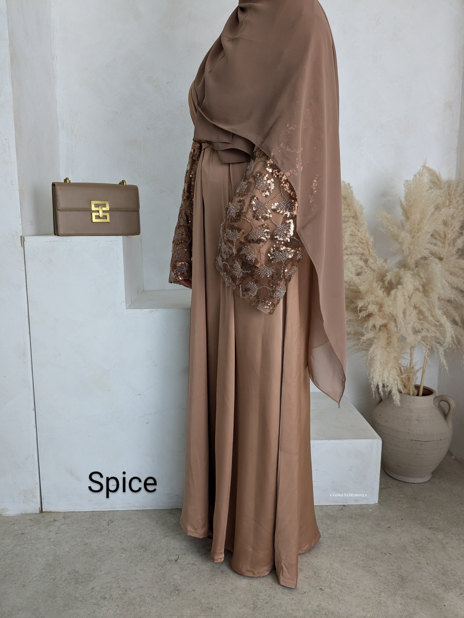 A beautiful Satin Abaya with embellished sleeves. Comes with a matching hijab and belt.